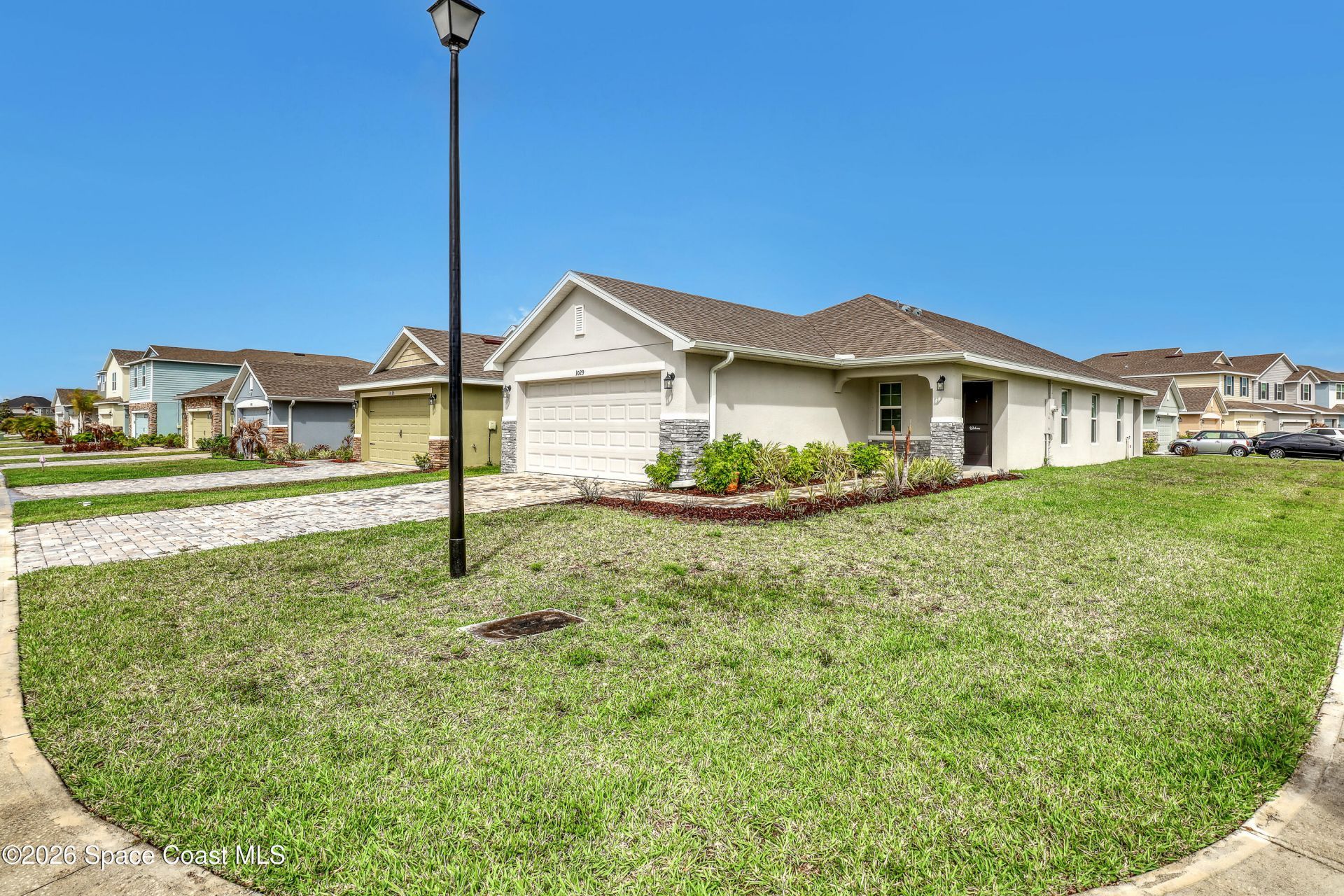 Stunning CORNER lot with 3-bedroom, 2-bath concrete block residence built in 2023, located in the highly sought-after GATED community of The Gardens at Waterstone. Beautifully maintained and designed for modern living, this home features gorgeous TILE floors, generous island and a lovely eat-in kitchen--perfect for culinary prep, entertaining, and everyday enjoyment. All upgraded cabinets, hardware, blinds, and STAINLESS-STEEL kitchen appliances which convey with the purchase. Other features include, paver drive and stone accents.The open-concept floor plan offers SPLIT bedrooms for added privacy. The lovely primary suite is a true retreat, complete with a walk-in closet and a double-vanity en-suite featuring a stunning walk-in shower. Two comfortable guest bedrooms provide flexibility for family, visitors, or a home office, while the guest bathroom includes a spacious tub and tasteful finishes.Have peace of mind with hurricane shutters and a complete irrigation system.Step outside Step outside to the patio, grab a cool drink, and unwind, ideal for both relaxing and entertaining. Add a screen and perhaps fencing for privacy. Conveniently located with easy access to St. Johns Heritage Parkway, this home is just a short drive to beautiful beaches, great restaurants, shopping, an hour drive to Walt Disney World and all the attractions, as well as the Kennedy Space Center. The neighborhood offers a low HOA, along with a new community pool and playground, making this exceptional property the PERFECT place to call HOME.CALL NOW for a showing at your convenience.