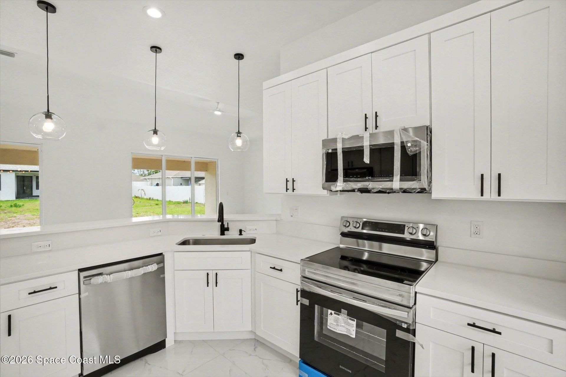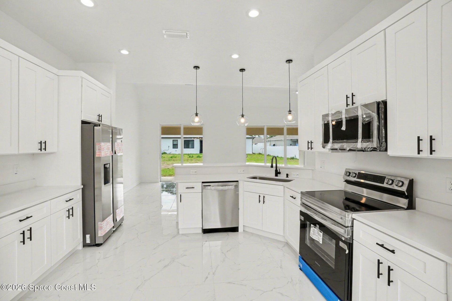 This beautifully designed 4 bed 2 bath concrete block home features elegant tile throughout its 2,052 square feet of living space. The modern kitchen includes stainless steel appliances, granite countertops, small breakfast nook, bar, and pendant lighting, perfect for cooking and entertaining. With four bedrooms and two baths, theres plenty of room for family and guests. This home has a split plan with a connecting bathroom for one bedroom that can be used when company is in town. The primary suite has 2 large walk-in closets, double vanity, tile shower, and separate tub and toilet, a large patio accessible through sliding glass doors, along with the living and dining areas also having double sliders, bringing in lots of natural light. All windows are impact resistant for added security. This home is a must-see for anyone looking for comfort and style!